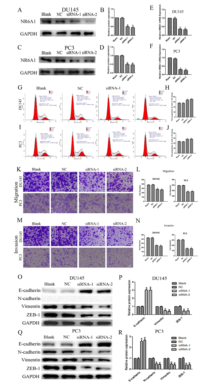 Figure 2: (A)(B) NR6A1 protein expression after 48 hours of transfection with NR6A1 siRNA or NC in DU145. (C)(D) NR6A1 protein expression after 48 hours of transfection with NR6A1 siRNA or NC in PC3. GAPDH was used as a loading control. (E) NR6A1 mRNA expression in DU145 after 24 hours of transfection with NR6A1 siRNA or NC. (F) NR6A1 mRNA expression in PC3 after 24 hours of transfection with NR6A1 siRNA or NC. (G)(H) The knockdown of NR6A1 resulted in G0/G1 phase cell cycle arrest in DU145. (I)(J) The knockdown of NR6A1 resulted in G0/G1 phase cell cycle arrest in PC3. Cell-cycle analysis was performed at 48 hours post-transfection by staining DNA with propidium iodide prior to flow cytometry. Cells transfected with NR6A1 siRNA arrest in G1 phase are compared with Blank and NC. (K)(L) Decreased NR6A1 levels inhibited migration in DU145 and PC3. (M)(N) Decreased NR6A1 levels inhibited invasion in DU145 and PC3. Original magnification 100×. (O)(P) Western blot analysis was used to detect the changes in EMT markers in DU145. Down-regulated expression of NR6A1 reversed changes in EMT markers’ expression with a gain in E-cadherin expression and a loss of vimentin and ZEB-1 in DU145. N-cadherin was not expressed in DU145. (Q)(R) Western blot analysis was used to detect the changes in EMT markers in PC3. Down-regulated expression of NR6A1 reversed changes in EMT markers’ expression with a gain in E-cadherin expression and a loss of N-cadherin, vimentin and ZEB-1 in PC3. GAPDH was used as a loading control. All data are presented as mean± SD of at least three independent experiments. *P < 0.05 compared with Blank or NC.