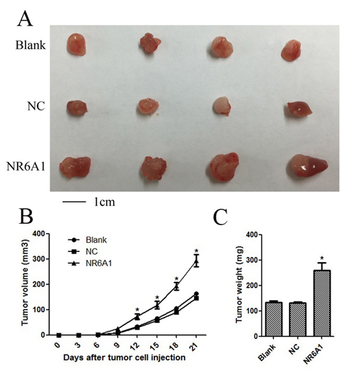 The study was approved by Medical Laboratory Animal Welfare and Ethics Committee of Nanjing Medical University. BALB/c nude mice were randomly divided into three groups, and each contained four mice. Cells (5×106 cells in 200μl) were suspended with 100μl PBS and 100μl Matrigel Matrix, and injected subcutaneously into the left armpit of each mouse. The volume and weight of the resulting tumors were measured every three days with calipers and electronic scale. The volume was calculated with the formula of length×width2×0.52. The mice were humanely sacrificed 3 weeks after injection, and the tumors were dissected. The methods were performed according to the approved guidelines.