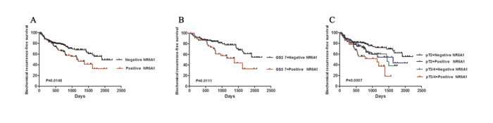NR6A1 has been shown to be expressed in maturing male germ cells in mouse models [8, 28, 29], and plays a vital role during embryogenesis and gametogenesis in the mouse [10, 30, 31]. Additionally, this gene is frequently expressed in the normal mammary gland tissue, and is lower expressed in ER+ and ER- breast cancer [13]. Here, we analyzed the expression of NR6A1 on samples obtained from 303 PCa samples. The results revealed that NR6A1 protein was expressed in 29.7% of total PCa patients, and the percentage of NR6A1 mRNA expression was 28.13% (9/32). Furthermore, positive NR6A1 expression was found to be associated with GS and tumor stage in PCa. After performing univariate and multivariate analyses, NR6A1 positive expression was found as a significant predictor for biochemical recurrence of PCa patients. More importantly, we found that the patients who had positive NR6A1 expression together with having tumor stage pT3/4 increased risk of biochemical recurrence compared with the other groups. Using the similar statistical analysis, the results showed that in subset of low-middle grade (GS≤7), patients with positive NR6A1 expression had a shorter biochemical recurrence-free survival than GS≤7 and negative NR6A1 expression. Our results strongly suggest that NR6A1 could be of clinical value as a prognostic factor for biochemical recurrence.