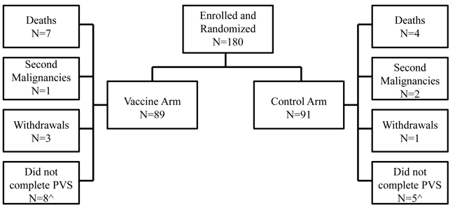 Figure 1: Consort diagram. Flow of patients through the study. ^The number of patients that did not complete the primary vaccination series (PVS) includes patients that withdrew, met the primary endpoint (recurrence, second malignancy, or death from any cause), or chose not to continue on study before completing the PVS.