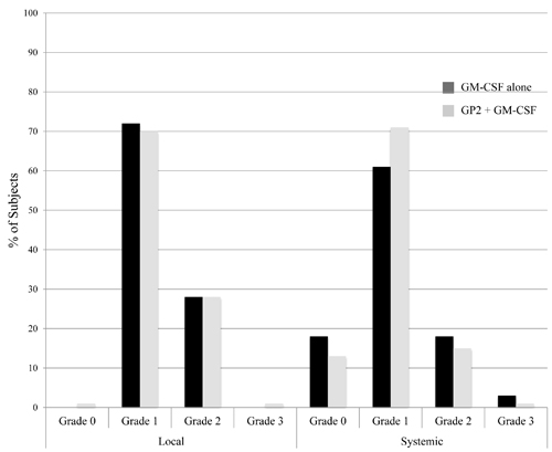 Figure 2: Maximum toxicity. The maximum local and systemic toxicity experienced by patients administered the GP2+GM-CSF vaccine were comparable to those experienced by patients receiving GM-CSF alone.