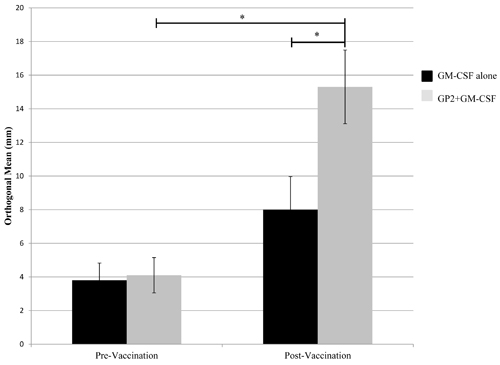 Figure 3: In vivo immunologic response to vaccination. In vivo immune responses were determined using a delayed type hypersensitivity (DTH) reaction. Patients who were vaccinated with GP2+GM-CSF had a significant increase in their DTH reaction to both the immunizing peptide post-vaccination compared to pre-vaccination. (* = P < 0.001).