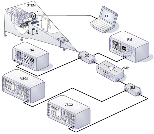 Figure 1: Schematic of the system. GTEM, Schaffner 250 GTEM chamber; VSG1, Agilent E8267D vector signal generator (250 KHz-20 GHz) operating at 2.45 GHz; VSG2, Agilent E4438C vector signal generator (250 KHz-4 GHz) operating at 900 MHz; AMP, research amplifier 15S1G3 (0.8-3 GHz); DC, NARDA 3282B-30 directional coupler (800-4000 MHz); SA, Agilent E4407B spectrum analyzer (9 KHz-26.5 GHz); PM, Agilent E4418B power meter; SM, Agilent 11636a signal mixer; RH, rat holder; IP, EF Cube isotropic probe; R, rat.