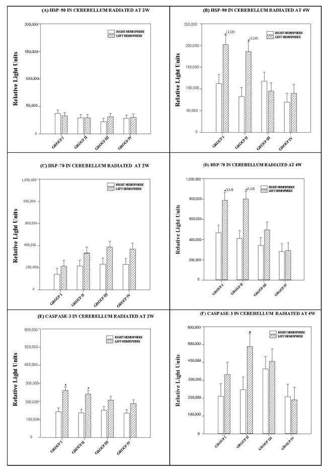 b) The ChELISA results (Figure 3 and 4) to detect HSP90, HSP70 and caspase-3 in the cerebral cortex and cerebellum, as well as polyclonal antibody were determined by two-way ANOVA, using protein radiation concentration in the right and left hemispheres and the interaction of one or more frequencies. The Holm-Sidak test for multiple comparisons was subsequently applied.