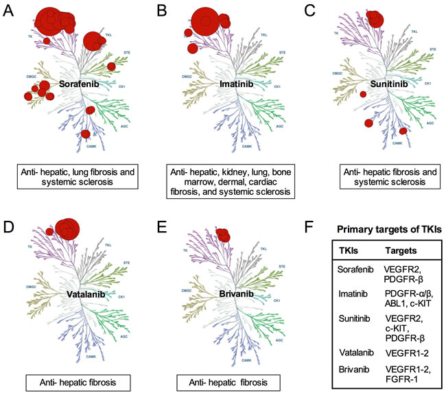 Figure 1: Anti-fibrotic mechanism of several TKIs. A. Sorafenib exerts several anti-fibrotic effects via inhibiting TKs, TKLs, STEs, CMGCs and CAMKs; B. Imatinib exerts various anti-fibrosis effects via inhibiting of TKs; C. Sunitinib exerts anti-fibrosis effects via inhibiting TKs and CAMKs; D.Vatalanib exert anti-hepatic fibrosis effects via inhibiting TKs; E. Brivanib exert anti-hepatic fibrosis effects via inhibiting TKs; F. TKIs exert anti-fibrotic effects by affecting different targets.