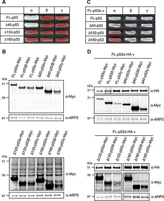 Figure 3: Transcriptional activity and dominant-negative effect of p53 main isoforms in FASAY-RGC strain. (A) Transcriptional activity of p53 main isoforms expressed under the control of the strong GPD promoter. (B) Western blot analysis of the expression level of Myc-tagged p53 isoforms using anti-Myc antibodies. ARP5 was used as a loading control. (C) Dominant-negative effect of FL-, Δ40-, Δ133- and Δ160-p53 isoforms over FL-p53α-WT. Isoforms of p53 were expressed under the control of the strong GPD promoter and FL-p53α-WT-HA was expressed under the control of the mild ADH promoter. (D) Western blot analysis of the expression level of FL-p53α-WT-HA and Myc-tagged isoforms FL-, Δ40-, Δ133- and Δ160-p53 using anti-HA and anti-Myc antibodies. ARP5 was used as a loading control.
