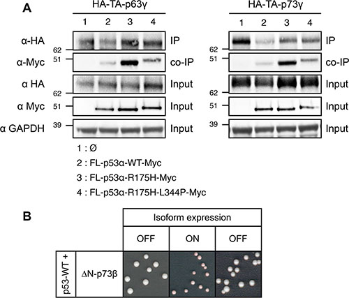Figure 6: Investigation of the mechanism of the dominant-negative effect exerted by FL-p53α-R175H over TA-p63γ and TA-p73γ in FASAY-RGC strain. (A) TA-p63γ-HA (left panel) or TA-p73γ-HA (right panel) was co-expressed with FL-p53α-WT-Myc, FL-p53α-R175H-Myc or FL-p53α-R175H-L344P-Myc. TA-p63γ-HA and TA-p73γ-HA proteins were immunoprecipitated using a rat anti-HA antibody (Roche). The immune complexes were subjected to western blotting. Immunoprecipitated HA-tagged proteins were detected using a rabbit anti-HA antibody (Clontech) and co-immunoprecipitated Myc-tagged proteins were detected using a mouse anti-Myc antibody (Clontech). 25 μg of the extract used for the immunoprecipitations were loaded as a control of the presence of HA- and Myc-tagged proteins (input). (B) Prion propagation assay of the dominant-negative ΔN-p73β isoform in yeast. Wild-type FL-p53α expression was placed under the control of the constitutive GPD promoter whereas the expression of ΔN-p73β isoform was placed under the control of the glucose-repressible GAL promoter which is switched ON by galactose and switched OFF by glucose.