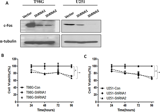 Figure 1: c-Fos expression and cell viability were inhibited by ShRNA. A. Western blot analysis performed on control vector and c-Fos shRNA using anti-c-Fos, and anti-α-tubulin antibodies. B. T98G glioma cell viability was inhibited by ShRNA1 and ShRNA2. *P<0.05; t-test. C. The viability of U251 glioma cells was inhibited by ShRNA1 and ShRNA2. *P<0.05; t-test.