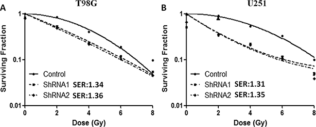 Next, we investigated whether c-Fos silencing was able to increase the sensitivity of glioblastoma cells to radiation. For T98G and U251 cells, both shRNA1-treatment (SER=1.34 and 1.31, respectively) and shRNA2-treatment (SER=1.36 and 1.35, respectively) enhanced radiosensitivity (Figure 2, P<0.05, ANOVA test; SF2=0.49 for T98G c-Fos ShRNA cells, SF2=0.33 for U251 c-Fos ShRNA cells). As SER=1 suggests an additive radiation effect, SER >1 a supra-additive effect, and SER<1 a sub-additive effect. Thus, SER=1.43, more than 1, means c-Fos silence could increase the radiosensitivity to radiation. These data suggested that c-Fos may be a critical regulator of radiation response in glioblastoma cells.