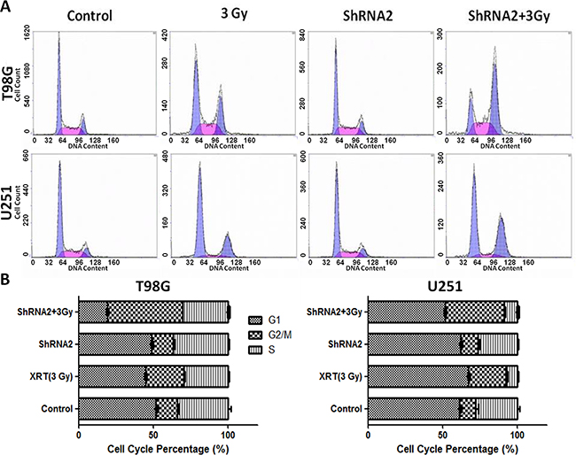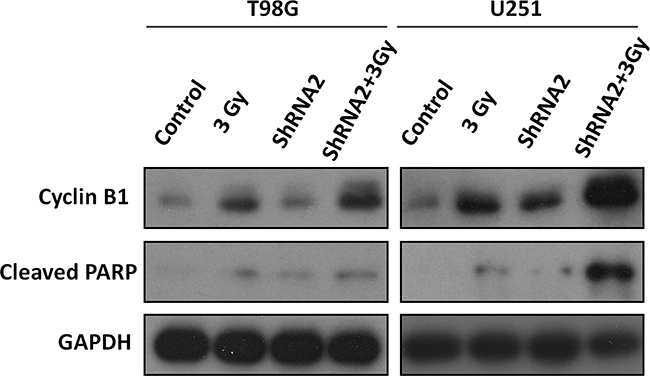 Figure 5: Western blot analysis of cell cycle and apoptosis-related proteins. T98G-3Gy cells, T98G-ShRNA+3Gy cells, U251-3Gy cells, and U251-ShRNA+3Gy cells were harvested 48 hours after 3 Gy radiation. Lysates were subjected to Western blot analysis with the labeled antibodies.