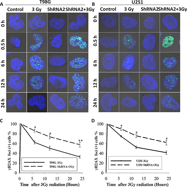 Figure 4: c-Fos knockdown delayed DNA damage repair in T98G and U251 cell line. A. γH2AX foci in c-Fos-depleted T98G cells vs. control at various time points following 3 Gy radiation. Original magnification, x600. B. γH2AX foci in c-Fos-depleted U251 cells vs. control at various time points following 3 Gy radiation. Original magnification, X600. C. γH2AX foci positive cells at various time points following 3 Gy radiation in both T98G-3Gy cells and T98G-ShRNA2+3Gy cells. *P<0.05; **P<0.01, t-test. D. γH2AX foci positive cells at various time points following 3 Gy radiation in both U251-3Gy cells and U251-ShRNA2+3Gy cells. *P<0.05, **P<0.01, t-test.