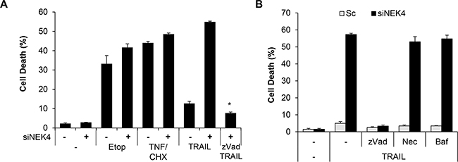 Figure 2: Downregulation of NEK4 induces apoptotic cell death in TRAIL-treated cells. A. A549 cells transiently transfected with scrambled siRNA (-) or NEK4 siRNA (+) were further treated with 50 mM etoposide (Etop, 20 h), TNF and cyclohexamide (TNF/CHX, 30 ng/μl and 10 ng/μl, 4 h), and TRAIL (20 ng/ml, 4 h) in the presence or absence of zVAD ( 40 mM). Subsequently, cell death was determined at different time points. B. A549 cells transiently transfected with scrambled siRNA (▫) or NEK4 siRNA (▪) were treated with TRAIL (20 ng/ml) with or without cell death inhibitors (40 mM zVAD, 10 mM necrostatin-1 (Nec), or 100 nM bafilomycin (Baf)), and the number of dead cells was determined. Data are presented as the mean ± SEM (n = 3) and differences were considered significant at *p<0.05.
