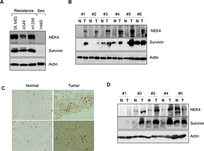 Figure 6: NEK4 expression is decreased in human lung and colon cancer tissues. A. TRAIL-resistant lung cancer cell lines (SK-MES-1, A549, and H1299) and TRAIL-sensitive (Sen) lung cancer cells (H460) were cultured and harvested. NEK4 and survivin expression levels were assessed by Western Blot analysis. B. Expression of NEK4 and survivin was assessed by Western blotting in lung cancer tissues (T, tumor tissue; N, corresponding normal tissue). C. Representative photomicrographs of NEK4 immunohistochemical staining in lung cancer tissue. NEK4 in lung cancer tissue was examined by immunohistochemical analysis on a tissue microarray and its expression increased (right) in cancer tissues. D. Expression level of NEK4 and survivin in colon cancer was examined with Western blotting (T, tumor tissue; N, corresponding normal tissue).