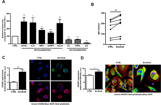 BTK is involved in macrophages lineage commitment to inflammatory profile [25]. Several evidences have shown that NLCs are closely associated to tumor-associated macrophages (TAM) with peculiar M2-skewed properties [8, 10, 11]. We sought to determine whether treatment with ibrutinib further stimulates the expression of M2 polarization markers. After 24 hours of treatment, the transcriptional signature of NLCs exposed to ibrutinib showed the induction of M2 markers CD163 (P<0.01), IL10 (P<0.05), MRC1 (CD206) (P<0.01), CCL18 (P<0.01) and PD-L1 (P<0.05) compared to control (n=8) and the concomitant down-regulation of M1 macrophages markers IL-1, TNFα and IL-2 (P<0.01 for all) (Figure 3A). These data were confirmed by an induction of the surface expression levels of M2 polarization markers CD163 and CD206 compared to untreated controls (n=7, P<0.01 for all) (Figure 3B and 3C). Of interest, we also detected the induction of NAMPT, known to enhance the immunosuppressive profile of NLCs [11] (Figure 3A and 3D).