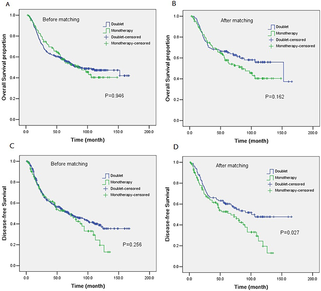 Propensity score matching is a tool for causal inference and adjust a treatment effect for measure confounders in non-randomized studies using SPSS. The software generates estimation of propensity score using logistic regression and specifying nearest-neighbor matching with all covariates. Detailed balance statistics and relevant graphs are produced by the program“PS Matching”in SPSS [13]. In the present study, Age, Gender, T stage, N stage, TNM stage, Type of resection, Histology and Location of tumor were entered into a non-parsimonious multivariable logistic regression model. By this means, 107 of 107 patients who underwent monotherapy were matched with 107 of 394 patients who were treated with doublet with similar propensity scores (Table 1). Patient demographics and tumor characteristics for the matched groups were listed (Table 1).