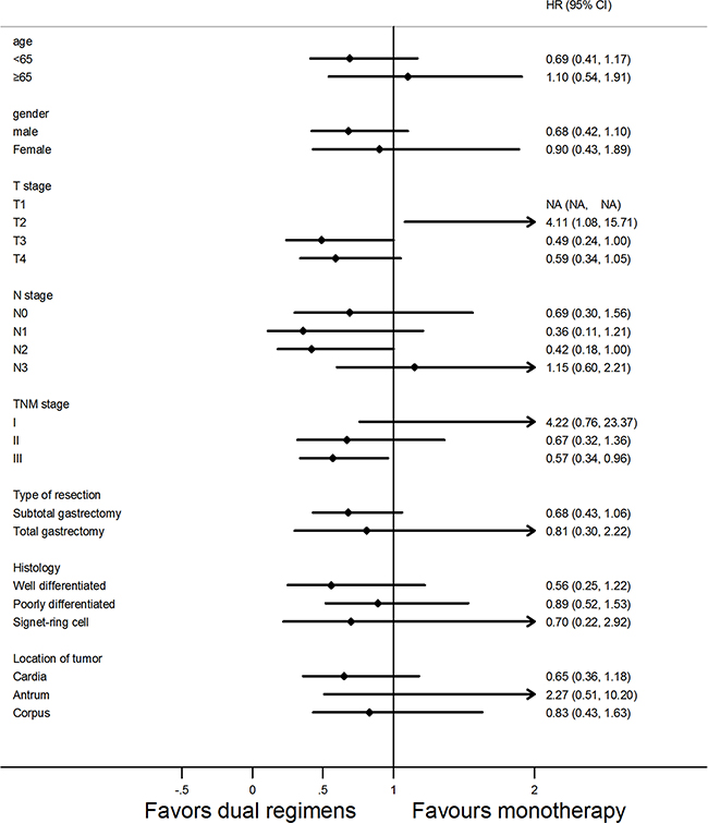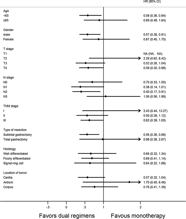 Figure 2: Forest plot of overall survival (OS) according to the regimens of adjuvant chemotherapy in subgroup analysis. Abbreviations: HR, hazard ratio, HR <1 implies a lower risk of death for patients; 95% CI, 95% confidence intervals.