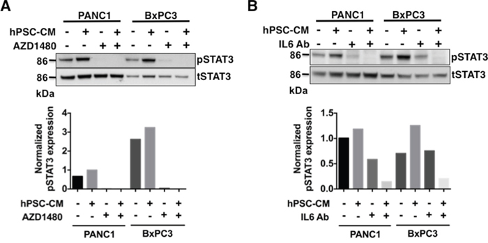 Figure 3: Pharmacological inhibition of JAK/STAT3 signaling or blocking IL-6 inhibits phosphorylation of STAT3 in hPSC-CM protein PDAC treated cells. PANC1 and BxPC3 cells were treated with hPSC-CM with or without JAK/STAT3 inhibitor AZD1480 (100 nmol/L) A. or IL-6 neutralizing antibody B. At the end of the study, cell lysates were analyzed for total STAT3 and phospho-STAT3 levels by immunoblot analysis. Densitometry analyses of pSTAT3 normalized to tSTAT3 was shown in the bottom panels of A and B. AZD1480 or IL-6 Ab treatment inhibited hPSC-CM induced activation of STAT3.