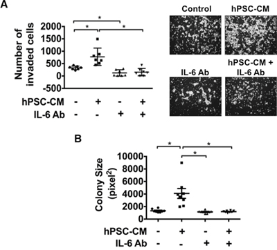 5x104 cells were suspended in media containing 0.33% Select Agar (Invitrogen, Carlsbad, CA) and plated on a bottom layer of media containing 0.5% Select Agar. Plates were incubated at 37°C for 2-3 weeks prior to imaging. IL-6 neutralizing antibody and/or hPSC-CM, and/or mPSC-CM protein was added directly into the top agar layer during plating. Colonies were photographed and quantified using ImageJ and analysis was performed with Prism software.