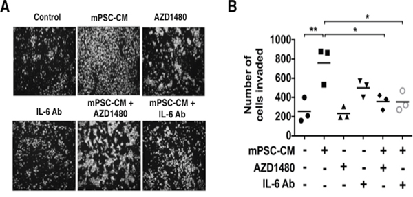 Figure 5: Mouse PSC-CM mediates activation of PanIN cell invasion through IL6-JAK-STAT3 signaling. Mouse PanIN cells were treated with mPSC-CM (100μg total protein/ml) with or without AZD1480 (100 nmol/L) or IL-6 neutralizing Ab and analyzed for cell invasion. A. Images demonstrate representative pictures from each treatment group. B. PanIN cell invasion analysis results showed that either IL-6 neutralizing Ab or AZD1480 significantly blocked mPSC-CM induced activation of cell invasion. * – P < 0.05; ** – P < 0.01.