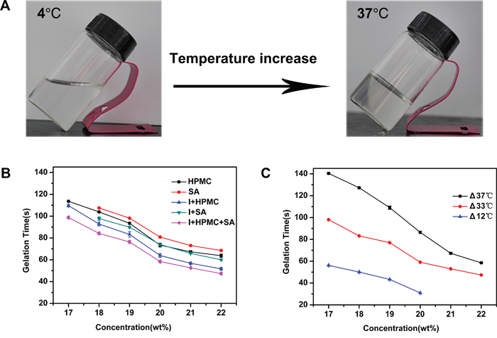 The thermo-sensitivity of the PSHI composite hydrogels was measured using the visual tube inversion method [30]. The sol-gel transition behavior was evaluated in this study. Briefly, 3 ml of PSHI was transferred into a 20-mm-diameter glass vial and incubated in a 37°C water bath. The time when the solution stopped flowing was reported as the gelation time. The PSHI composite hydrogels were also incubated at other temperatures (0°C, 4°C and 25°C) and subsequently gelled at 37°C. The gelation time for the various temperature differences was also recorded (n=3).