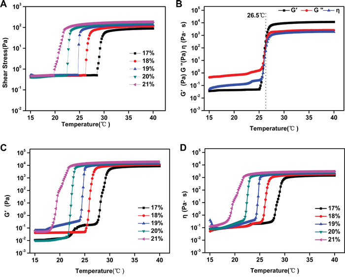 Figure 2: A. The shear stress of PSHI with a temperature increase. B. The total viscoelasticity of 18% PSHI. The storage modulus (G’) and the viscosity (η) of PSHI C-D. with P407 at different concentrations (17%, 18%, 19%, 20% and 21%, respectively) with a temperature increase.
