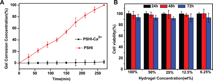 Figure 3: A. Erosion of PSHI-Ca2+ incubated with PBS compared to PSHI alone. B. In vitro cytotocity of a PSHI-Ca2+ hydrogel in L929 cells. Data are expressed as the Mean±SD.