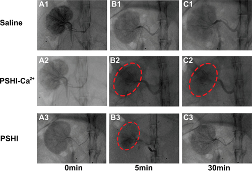 Figure 4: DSA images of normal rabbit kidneys after renal artery embolization with different formulations: Saline (Plot B1), PSHI-Ca2+ (Plot B2) and PSHI (Plot B3). Plots A1, A2, and A3 correspond to DSA images before renal artery embolization, respectively. Plots C1, C2, and C3 correspond to DSA images 30 min after renal artery embolization, respectively. The red circles indicate the embolized kidney.