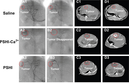 Figure 6: DSA images of VX2 liver tumors in rabbits after embolization with saline (B1), PSHI-Ca2+ (B2) and PSHI (B3), A1, A2 and A3 are DSA images before embolization. CT images of rabbits bearing VX2 tumors after treatment with saline (D1), PSHI-Ca2+ (D2) and PSHI (D3), C1, C2 and C3 are corresponding CT images before embolization.