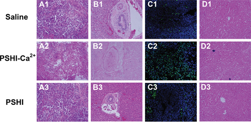 Figure 7: Histopathological H&E staining, TUNEL assay and toluidine blue-eosin staining set of tumor and embolic arterial sections after treatment with saline (A1-D1), PSHI-Ca2+ (A2-D2) and PSHI (A3-D3) (original magnification×100).