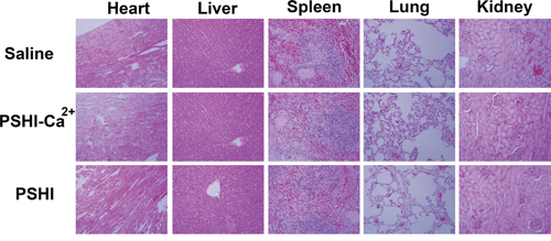 The aim of this study was to demonstrate the ability of PSHI-Ca2+ to occlude a blood vessel in vivo and thus confirm its potential as a liquid embolic agent intransarterial embolization therapy. In this work, PSHI-Ca2+ was shown to successfully occlude rabbit normal renal artery and tumor. Moreover, the necrosis level and gel distribution indicated that the composite hydrogel had occluded the peripheral blood vessels during TAE therapy. In addition, an ex vivo histological analysis of the major organs after treatment showed no noticeable damage to the organs and a low toxicity of localized treatment. While, the percutaneous ethanol injection could damage the liver and cause serious painful to patients [28]. Thus, TAE therapy with thermo-sensitive composite PSHI-Ca2+ hydrogels could be a promising embolic agent for liver tumor treatment. PSHI-Ca2+ exhibited excellent embolism efficacy, the injection method was complicated. The injection method should be improved in future studies. The duration and stability of the embolization and the post-embolization drawback should be optimized. Further researches should be taken to explore the characteristics of drug loading PSHI-Ca2+ for chemoembolic-based tumor treatment.