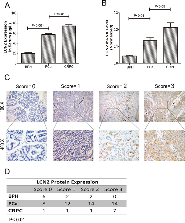 Figure 1: LCN2 expression was upregulated in human PCa tissues. A. The LCN2 levels were significantly upregulated in serum samples from CRPC patients than in those from PCa patients and BPHs. B. LCN2 mRNA levels were upregulated in tissue samples from CRPC patients than in those from PCa patients and BPHs. C. The LNC2 protein showed a typical cytoplasma staining pattern in prostate tissues via IHC method(original magnification, ×100 or ×400). Each case was given a scale of 0 to 3 (0=no staining, 1=weak staining, 2=intermediate staining, and 3=strong staining). D. Enhanced immunoreactivity of LCN2 in CRPC tissues was observed in CRPC tissues.