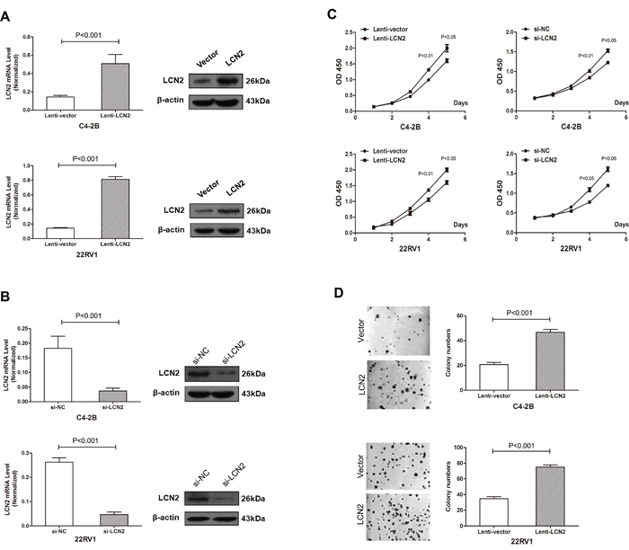 Figure 2: High expression of LCN2 promoted CRPC cell proliferation. A. Expression of LCN2 was dramatically increased in C4-2B and 22RV1 cells infected with a lentivirus encoding the LCN2 gene. B. Expression of LCN2 was decreased in C4-2B and 22RV1 cells afected with the LCN2 siRNA. C. A cell proliferation assay revealed that overexpression of LCN2 significantly enhanced the growth rate of C4-2B and 22RV1 cells. The knockdown of LCN2 markedly inhibited cell growth in C4-2B and 22RV1 cells. D. A colony formation assay confirmed that LCN2 overexpression promotes the proliferation of C4-2B and 22RV1 cells.