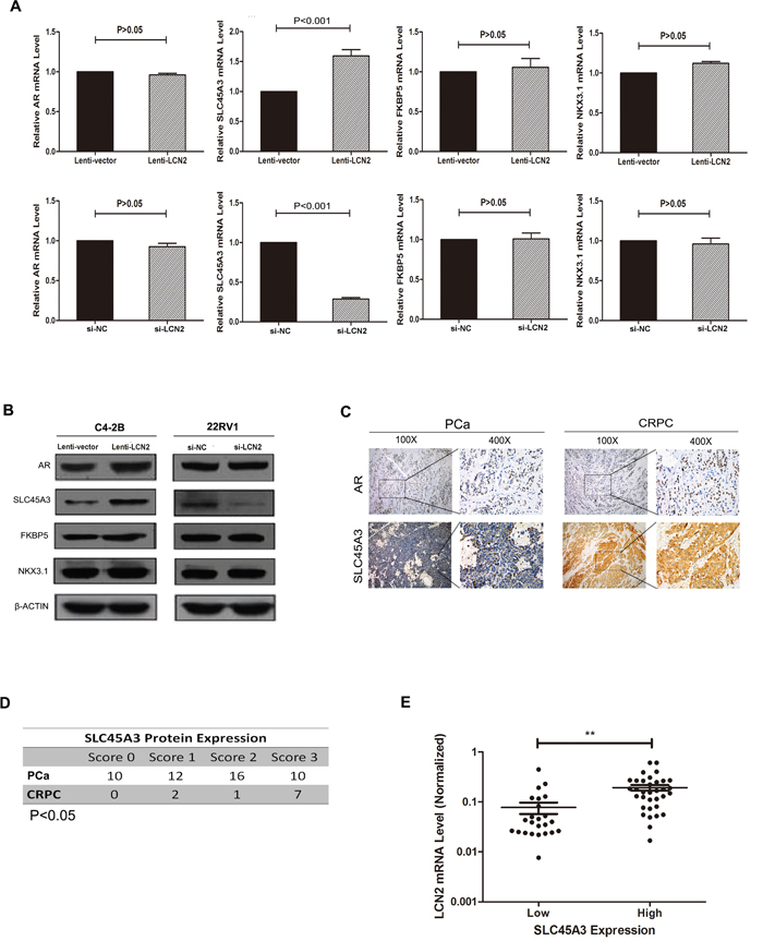 Figure 3: SLC45A3 expression was correlated with LCN2. A, B. SLC45A3 expression was increased in LCN2 over-expressed C4-2B cells and was decreased in LCN2 knockdown 22RV1 cells. LCN2 mRNA and protein levels were determined with RT-qPCR and western blot, respectively. C. The AR protein showed a typical nucleus staining pattern in prostate tissues via IHC method(original magnification, ×100 or ×400). D. The SLC45A3 protein were upregulated in CPRC tissues compared with PCas (P<0.05). E. SLC45A3 protein expression was positively correlated with LNC2 mRNA levels.
