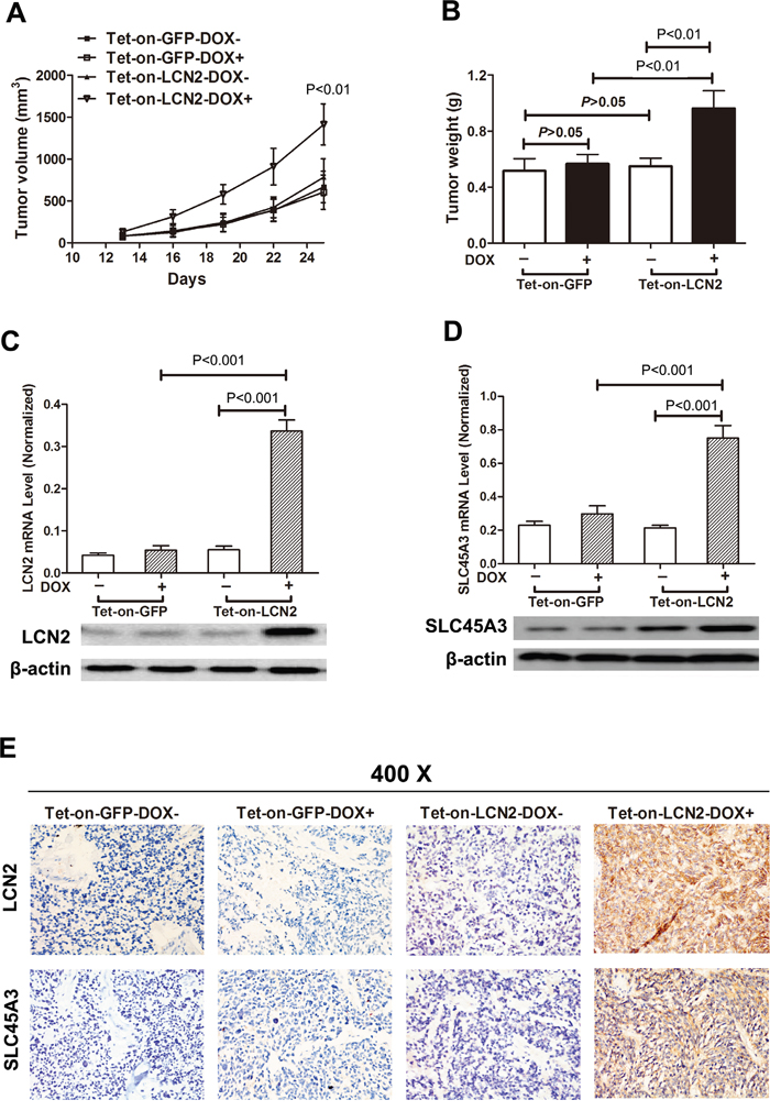 To further determine the biological significance of the above results, tumor formation assays were conducted in vivo. LCN2-overexpressed 22RV1 cells were injected subcutaneously at right flanks of each mouse and LCN2 expression was induced with DOX in drinking water via TET-ON system. Compared with control groups, overexpression of LCN2 promoted tumor growth with remarkably increased tumor volume and weight in nude mice (Figure 4A and 4B). LCN2 overexpression was validated in xenograft tumors and LCN2 induced SLC45A3 upregulation was demonstrated (Figure 4C, 4D and 4E).