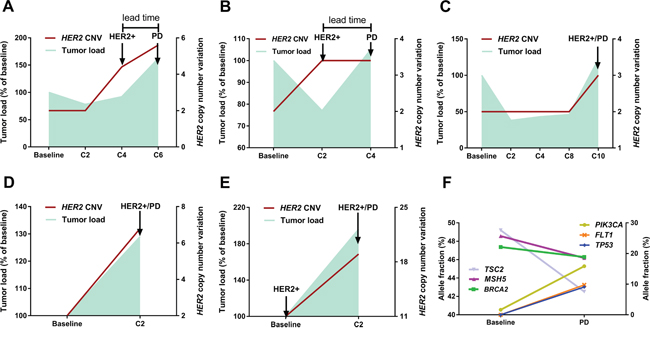 Figure 1: Serial monitoring of genomic alterations in ctDNA. (panel A, patient No.3) A typical case illustrates the relationship between fluctuation patterns of HER2 copy number (right Y axis) and dynamics of tumor load (left Y axis). Notably, HER2 amplification in ctDNA was identified 8 weeks earlier than the clinical establishment of disease progression by CT. (panel B, patient No.2) The tumor load moderately decreased after C2 whereas HER2 copy number was elevated, which was followed by immediate disease progression after C4. (panel C, patient No.17; panel D, patient No.5; panel E, patient No.8) Notable increase in HER2 copy number and tumor burden was concurrently detected, regardless of HER2 status at baseline. (panel F, patient No.5) Dynamic ctDNA profiling revealed intra-tumor heterogeneity and clonal evolution, as evidenced by the diverging patterns of fluctuation in identified mutations. The left Y axis refers to the allele fractions of mutations in genes TSC2/MSH5/BRAC2 and the right Y axis to genes PIK3CA/FLT1/TP53.