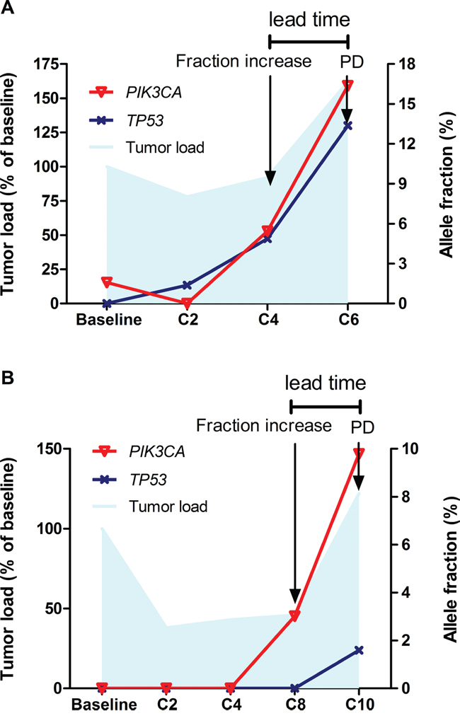 Besides, as a multiplex biomarker another purpose of ctDNA sequencing was to identify emerging mechanisms of resistance and propose candidate drug targets for salvage treatment. For example, regarding patients with obvious increase in the fraction of PI3KCA mutation before progression, predominant growth of PIK3CA mutation-carrying clone probably resulted in treatment failure and PI3K signaling blockade might be the optimal remedy for subsequent management.