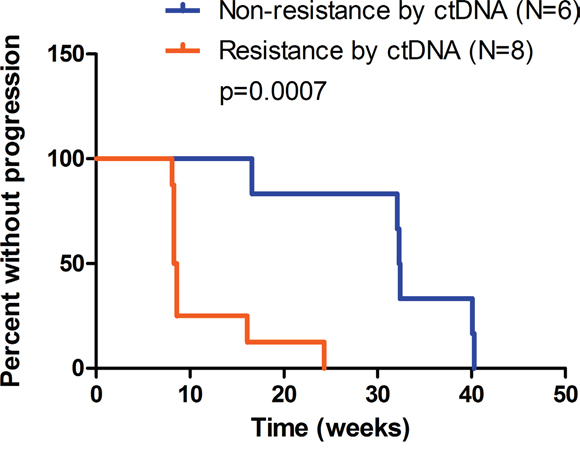 Figure 4. Progression-free survival (PFS) of patients with events of progressive disease (N=14). Based on sequencing data of C2 ctDNA, patients were evaluated as non-resistant (N=6) or resistant (N=8) using pre-defined ctDNA criteria. Non-resistance subset includes patient No.4, 6, 7, 15, 17, 18, and resistance subset includes patient No. 2, 3, 5, 8, 9, 11, 12, 14. Median PFS was 32.4 and 8.5 weeks respectively. P=0.0007 by log-rank test.