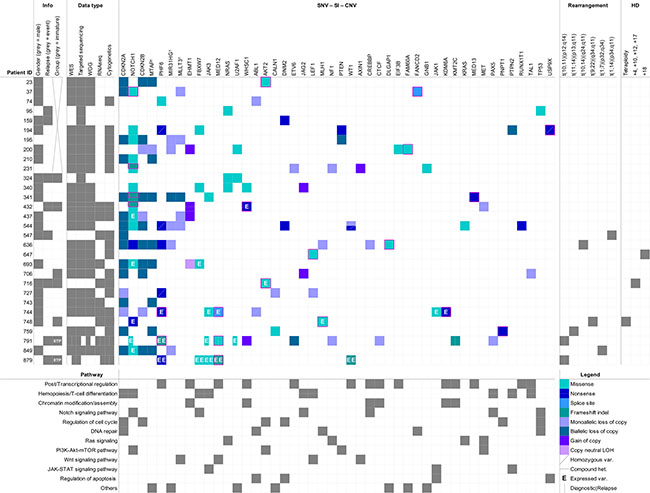 Figure 1: Overview of the SNVs, small indels and structural variations identified among 30 childhood T-ALL patients. Genes (top) are ordered according to the number of events identified in the cohort (descending order from left to right). Pathways (bottom) are ordered according to the number of genes identified as mutated (descending order from top to bottom). The ‘’Info’’ and ‘’Data type’’ sections respectively inform about the clinical data (gender, relapse status and differentiation group classification) and the type of informative data (WES, targeted sequencing, WGG, RNA-seq, cytogenetics) available for each patient. ETP-ALL cases are indicated directly in the corresponding square of the ‘’Group’’ column in the ‘’Info’’ section. SNVs and Indels unreferenced in COSMIC v72 are indicated by a pink frame and were considered as novel. The black cross stands for missing data. †: genes included in the deleted 9p region with tumor suppressor genes CDKN2A/B. WES: Whole Exome Sequencing; WGG: Whole Genome Genotyping; SNV: Single Nucleotide Variant; SI: Small Indel; CNV: Copy Number Variant; HD: Hyperdiploidy.