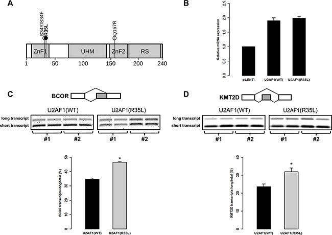 The pOTB7 plasmid containing U2AF1 cDNA was purchased from Harvard PlasmID Repository (clone # HsCD00321863) and subcloned into the Gateway compatible vector pDONR221. The R35L mutation was introduced into the cDNA sequence of U2AF1 using the QuickChange II XL Site Directed Mutagenesis kit (Agilent) with primers listed in Supplementary Table S5. Sanger sequencing (McGill University and Genome Quebec Innovation Centre) was performed to confirm the presence of the mutation. WT or R35L U2AF1 coding sequences were then subcloned into the Gateway lentiviral vector pLenti CMV Puro DEST (w118–1) using LR clonase Enzyme mix (Thermo Fisher Scientific). Lentiviruses were generated and Jurkat cells infected (two biologically independent replicates) as described above. Total RNA was extracted from infected cells using RNeasy Mini Kit and treated with RNase-Free DNase Set (Qiagen), and cDNAs were generated using M-MLV reverse transcriptase (Thermo Fisher Scientific). Overexpression of WT or R35L U2AF1 in Jurkat cells was measured by qPCR amplification as described above. To validate alternative splice site utilization at the BCOR and KMT2D/MLL2 target genes, as described elsewhere [32], RT-PCR was performed on cDNAs in duplicates using KOD Hot Start Polymerase as described previously with primers listed in Supplementary Table S5. PCR products were electrophoresed in agarose gel stained with SYBR Safe (Thermo Fisher Scientific), and quantified by densitometry using Image J software (version 1.49).