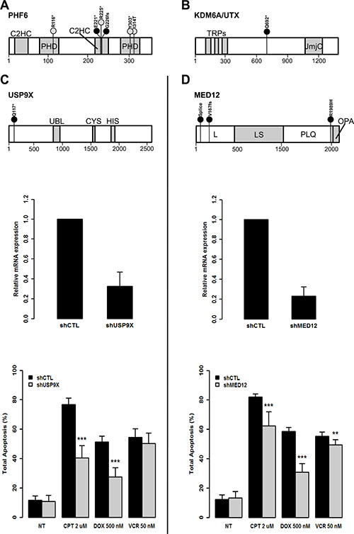 Figure 3: The loss of function of USP9X and MED12 protects from induced apoptosis in leukemic T-cells. (A) Schematic representation of PHF6 predicted protein including the two PHD type zinc finger domains (PHD) and the two CysCysHisCys type zinc finger domains (C2HC). Black circles indicate the location of new mutations. Grey circles indicate previously referenced mutations identified in this childhood T-ALL cohort. The size of the bars are representative of mutation frequencies in the cohort (PHF6 p.R225* was identified in three cases while all others were identified in one case). The amino acid scale is indicated at the bottom. (B) Schematic representation of KDM6A/UTX predicted protein including three tetratricopeptide repeat domains (TRPs) and the Jumanji C domain (JmjC). (C, top) Schematic representation of USP9X protein including the ubiquitin-like module (Ubl) and the USP-definitive cysteine and histidine box catalytic motifs (CYS and HIS). (D, top) Schematic representation of MED12 including the leucine-rich domain (L), the leucine- and serine-rich domain (LS), the proline-, glutamine-, leucine-rich domain (PQL) and the opposite paired domain (OPA). ShRNAs were used to knockdown expression of: USP9X (C, middle) and MED12 (D, middle) in Jurkat cells. Residual mRNA levels after shRNA transduction were measured by RT-qPCR. GAPDH was used as calibrator and non-mammalian shRNAs (shCTL) were used as control for normalization. In vitro apoptosis assays show overall reduced levels of apoptosis associated with knockdown of USP9X (C, bottom) and MED12 (D, bottom). DNA damage-induced apoptosis was provoked with 2 μM of Camptothecin (CPT) for 17 hours or 500 nM of Doxorubicine (DOX) for 18 hours or 50 nM of Vincristine (VCR) for 24 hours. Non-treated (NT) transduced cells were used as controls. Overall apoptosis levels were measured after 30 minutes of annexin V (AnV) propidium iodide (PI) double staining (AnV+/PI–, AnV+/PI+, and AnV–/PI+). Statistical significance was determined by a two-tailed Mann-Whitney U test; **P-values < 0.01; ***P-values < 0.001.
