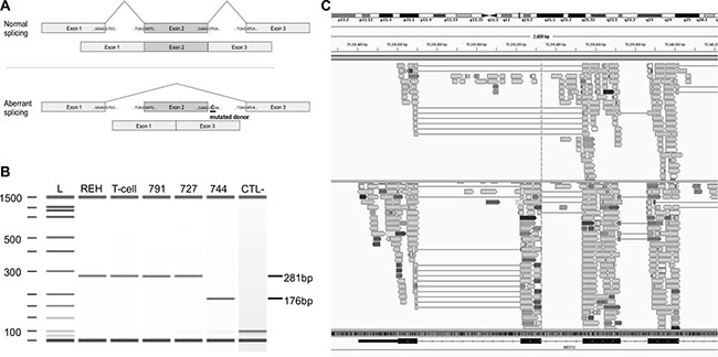 Figure 4: Mutation g.chrX:70339329T>C in MED12 causes the splicing of exon 2. (A) Schematic representation of the normal (top) and aberrant splicing (bottom) of MED12 transcripts from the normal and the identified mutant gene. In the presence of the mutation, the donor splice site of exon 2 (underlined) is skipped and exon 1 is directly spliced to exon 3, leading to an aberrant mature form of MED12 mRNA lacking exon 2. (B) Synthetic electrophoresis gel of MED12 PCR products (Methods). cDNAs were synthesized from mature RNA extracted from patient 744 mutated at g.chrX:70339329T>C, REH cells, mature T-cells (CD19-CD3+) isolated from cord blood samples and two T-ALL patients, WT for this position (791 and 727). Amplified fragments of 281 bp (WT samples) and 176 bp (mutated sample) were analyzed using Agilent 2100 Bioanalyzer. The 105 bp difference corresponds to the skipped exon 2. L: ladder; CTL-: negative control. (C) Screenshot of the Integrative Genomics Viewer (IGV) window presenting aligned RNA-seq data obtained from cases 744 (top) and a third T-ALL WT patient (693, bottom). The dotted line is centered on the donor splice site of exon 2 of MED12 (g.chrX:70339329). Case 744 shows aberrant splicing of exon 2, while 693 was WT for this position and shows a mature transcript that includes the exon 2.