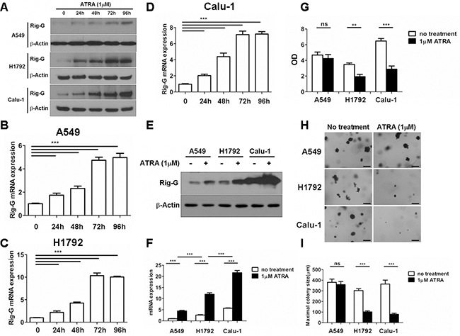 Figure 1: ATRA upregulates Rig-G expression and inhibits the growth of lung cancer cells in vitro. A–F. Total protein and RNA from A549, H1792, and Calu-1 cells were isolated after treatment with 1 μM of ATRA for 96 h. The expression of Rig-G protein was analyzed by western blot (A and E). The expression of Rig-G mRNA in three NSCLC cell lines (B–D and F) was measured by real-time PCR. The results are expressed as the mean ± SEM, ***p < 0.001 G. Lung cancer cell lines A549, H1792, and Calu-1 were treated with 1 μm ATRA for 96 h, after which cell proliferation was measured by ELISA (BrdU labeling) analysis. The results are expressed as the mean ± SEM, **p < 0.01; ***p < 0.001; n.s., not significant. H. A549, H1792, and Calu-1 cells were treated with 1 μm ATRA and assessed for growth in soft agar by using the anchorage-independent colony formation assay. Scale bars = 500 μm. I. The maximum colony size of A549, H1792, and Calu-1 cells in a soft-agar assay was determined. The results are expressed as the mean ± SEM, ***p < 0.001; n.s., not significant.