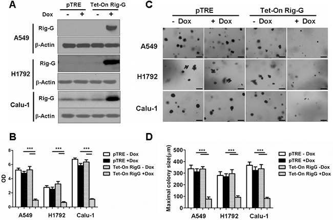 Figure 2: Rig-G inhibits lung cancer cell growth. A. The lung cancer cell (A549, H1792, and Calu-1) sublines pTRE and Tet-on Rig-G were cultured, respectively, in the presence or absence of Dox (2μg/mL) for 24h. The expression of Rig-G protein was detected by immunoblotting. B. The proliferation of the indicated cells was measured by ELISA (BrdU labeling) analysis. The results are expressed as the mean ± SEM, ***p < 0.001. C. The growth of the indicated cells in soft agar was assessed by using an anchorage-independent colony formation assay. Scale bars = 500 μm. D. The maximum colony size of A549, H1792, and Calu-1 cells in a soft-agar assay was determined. The results are expressed as the mean ± SEM, ***p < 0.001.