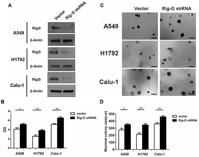 Figure 3: Rig-G knockdown increases lung cancer cell growth. A. Lung cancer cell A549, H1792, and Calu-1 were transduced with indicated shRNA. After selection, expression of Rig-G proteins was analysed. B. The indicated cells were transduced with control or Rig-G shRNA plasmids, and their proliferation was measured by ELISA (BrdU labeling) analysis. The results are expressed as the mean ± SEM, *p < 0.05; **p < 0.01. C. The growth of tumor cells transduced with indicated shRNA plasmids in soft agar was assessed by using an anchorage-independent colony formation assay. Scale bars = 500 μm. D. The maximum colony size assay in A549, H1792, and Calu-1 cells transfected with the indicated shRNA plasmids. The results are expressed as the mean ± SEM, *p < 0.05; **p < 0.01; ***p < 0.001.