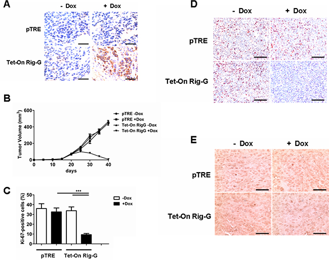 Figure 4: Rig-G protein results in decreased tumor growth in vivo. A. Nude mice were injected subcutaneously with the indicated cell lines, and the expression of Rig-G was examined by immunohistochemistry of paraffin-embedded sections. Scale bars = 100 μm. B. Tumors overexpressing Rig-G showed significantly slower growth (n = 5). C. Percentage of Ki-67-positive tumor cells. The results are expressed as the mean ± SEM, (n = 5), ***p< 0.001. D. Paraffin-embedded tumor sections were analyzed after staining with an anti-Ki-67 antibody. Scale bars = 100 μm. E. Apoptotic cells were identified by TUNEL staining. Scale bars = 100 μm.
