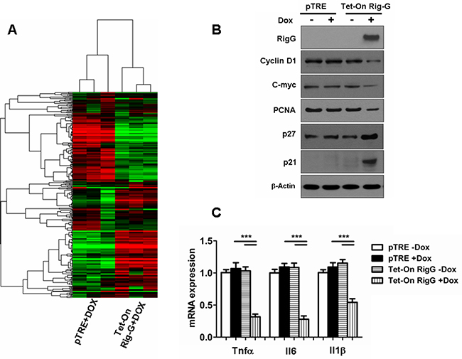 Figure 5: Rig-G inhibits specific growth pathways and inflammatory responses in tumor cells. A. Heat map of the experimental groups. Dendrogram and cluster analyses show a differential gene expression profile pattern in A549 cell lines with (right) and without (left) Rig-G overexpression. Green indicates downregulation, and red indicates upregulation. B. The expression of proliferation-related proteins in the indicated cells was analyzed by western blotting. C. Induction of inflammatory cytokine mRNAs in the indicated cells was measured by real-time PCR. The results are expressed as the mean ± SEM (n = 5), ***p < 0.001.