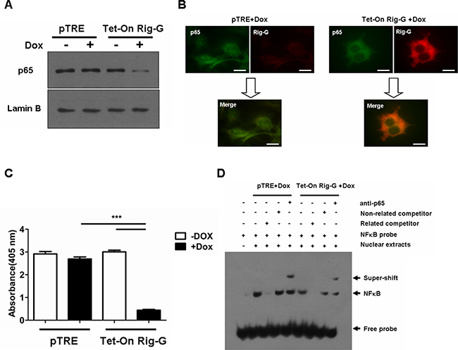 Figure 6: Rig-G inhibits NF-κB activation in A549 cells. A. The A549 sublines pTRE and Tet-On Rig-G were cultured, respectively, in the absence or presence of Dox (2 μg/mL) for 24 h. Nuclear protein from A549 cells was isolated. The expression of the indicated protein was analyzed by Western blot. B. Double-color immunofluorescence analysis was performed with the combination of anti- Rig-G (red) and anti-p65 (green). Scale bars = 10 μm. C. NF-κB activation was measured by ActivELISA assay in A549 cells with and without Rig-G overexpression. The results are expressed as the mean ± SEM (n = 3), ***p < 0.001. D. EMSA analysis of the DNA binding of NF-κB.