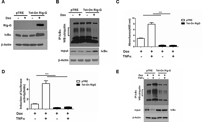 Figure 7: Effects of Rig-G protein on IκBα degradation. A. Western blotting analysis of IκBα expression in A549 sublines pTRE and Tet-On Rig-G. The cells were cultured respectively in the presence or absence of Dox (2 μg/mL) for 24 h. B. The pTRE and Tet-On Rig-G cells were incubated with the proteasome inhibitor MG132 (20μM) for 5h, lysed, and subjected to immunoprecipitation (IP) with anti- IκBα antibody. The resulting precipitates were detected by Western blot analysis with antiubiquitin antibodies. C. NF-κB activation in the indicated cells untreated or treated with 1 ng/mL TNFα for 1 h. The results are expressed as the mean ± SEM (n = 3), ***p < 0.001. D. The effect of Rig-G on the TNF-mediated inducibility of an NF-κB reporter construct. E. The indicated cells were incubated with the proteasome inhibitor MG132 (20μM) for 5h, and cells were untreated or treated with 1 ng/mL TNFα for 1 h, and cell lysates were immunoprecipitated (IP) with an anti-IκBα antibody, followed by Western blot analysis with an anti-ubiquitin antibody.