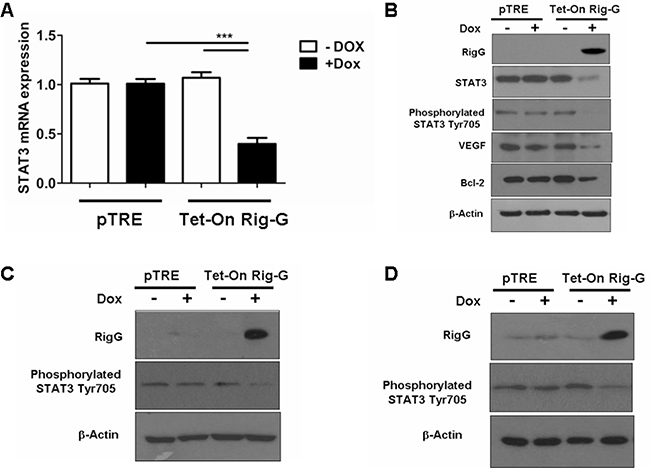 Figure 9: Rig-G inhibits STAT3 activity. A. Real-time PCR analysis of STAT3 mRNA expression in A549 sublines pTRE and Tet-On Rig-G. The cells were respectively cultured in the presence or absence of Dox (2 μg/mL) for 24 h. The results are expressed as the mean ± SEM (n = 5), ***p < 0.001. B. A549 sublines pTRE and Tet-On Rig-G were analyzed for the expression of the indicated proteins by immunoblot analysis. C and D. H1792 (C), and Calu-1 (D) sublines pTRE and Tet-On Rig-G were analyzed for the expression of the indicated proteins by immunoblot analysis.