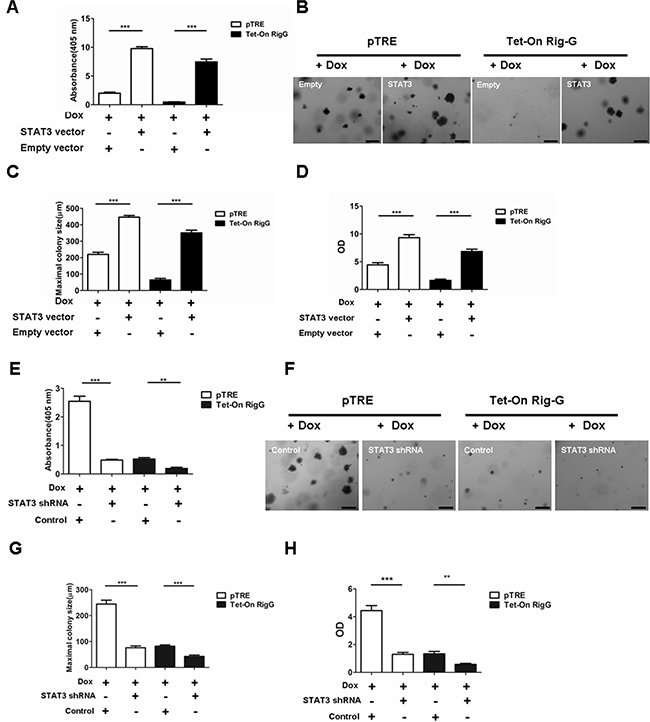 Figure 10: STAT3 inhibition is required for Rig-G decreasing lung cancer growth. A.The cells were cultured in the presence of Dox (2 μg/mL). NF-κB activity (ELISA assay) in A549 sublines pTRE and Tet-On Rig-G respectively transfected with an empty vector or STAT3 vector. The results are expressed as the mean ± SEM (n = 3), ***p < 0.001. B. Colony formation assay of A549 sublines pTRE and Tet-On Rig-G respectively transfected with empty vector or STAT3 vector. Scale bars = 500 μm. C. The maximum colony size of the indicated cells on soft agar was determined. The results are expressed as the mean ± SEM, ***p < 0.001. D. The proliferation of the indicated cells was measured by ELISA (BrdU labeling) analysis. The results are expressed as the mean ± SEM, ***p < 0.001. E. A549 sublines pTRE and Tet-On Rig-G were transduced with indicated shRNA plasmids. After selection, the cells were cultured in the presence of Dox (2 μg/mL). NF-κB activity was assay by ELISA. The results are expressed as the mean ± SEM (n = 3), **p < 0.01; ***p < 0.001. F. The growth of tumor cells transduced with indicated shRNA plasmids in soft agar was assessed by using an anchorage-independent colony formation assay. Scale bars = 500 μm. G. The maximum colony size assay in A549 sublines pTRE and Tet-On Rig-G cells transfected with the indicated shRNA plasmids. The results are expressed as the mean ± SEM, ***p < 0.001. H. The indicated cells were transduced with control or STAT3 shRNA plasmids, and their proliferation was measured by ELISA (BrdU labeling) analysis. The results are expressed as the mean ± SEM, **p < 0.01; ***p < 0.001.
